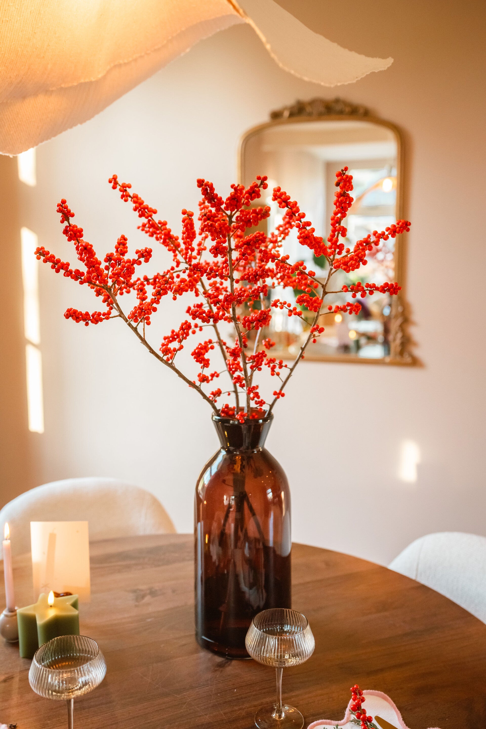 De bos van tachtig centimeter is een prachtige blikvanger die meteen sfeer in huis brengt. De rijk gevulde rode bessen zorgen voor een feestelijke, winterse uitstraling die perfect past bij de decembermaand. Door de royale lengte komt deze bos prachtig tot zijn recht in een ruime vaas.